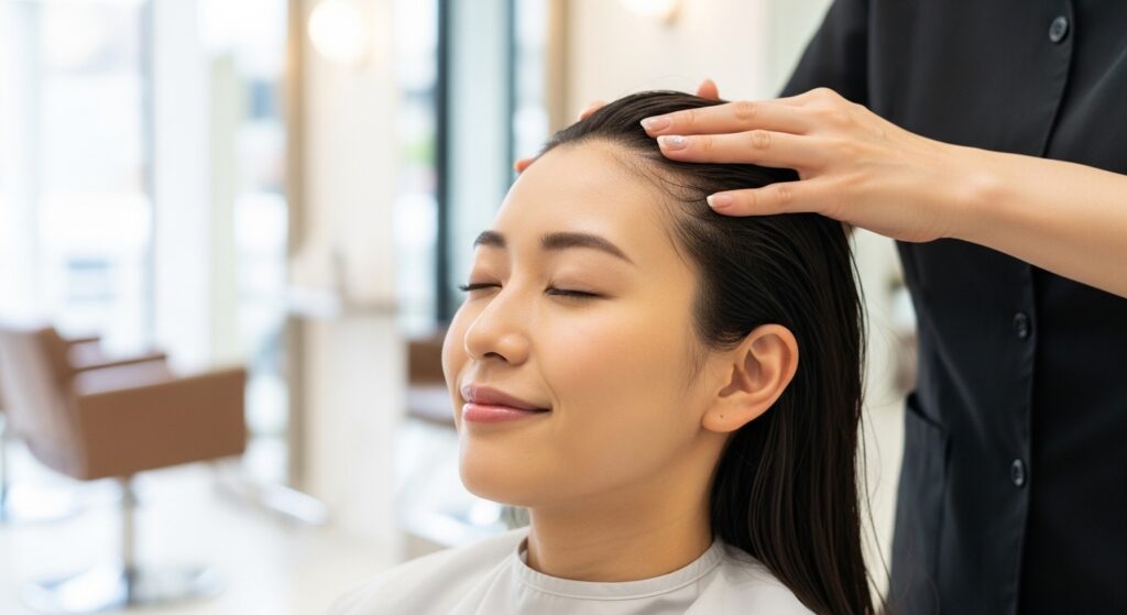💡 美容師のポイント: マッサージは力を入れすぎず、頭皮全体を軽く押す感覚で行うと血流が促進され、髪にハリとコシを与えます。